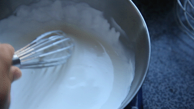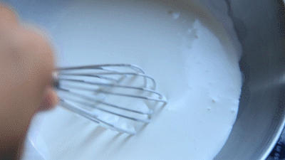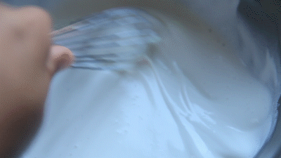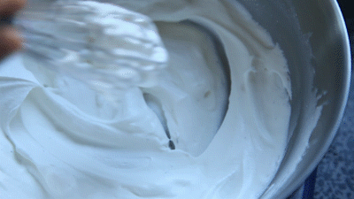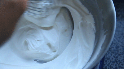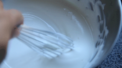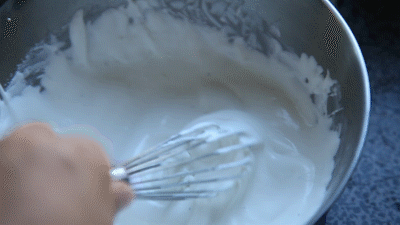5-6分发时,淡奶油变得更浓稠更细腻,搅拌时已经开始出现纹理,但这个纹理会瞬间消失,这个程度适合制作慕斯。