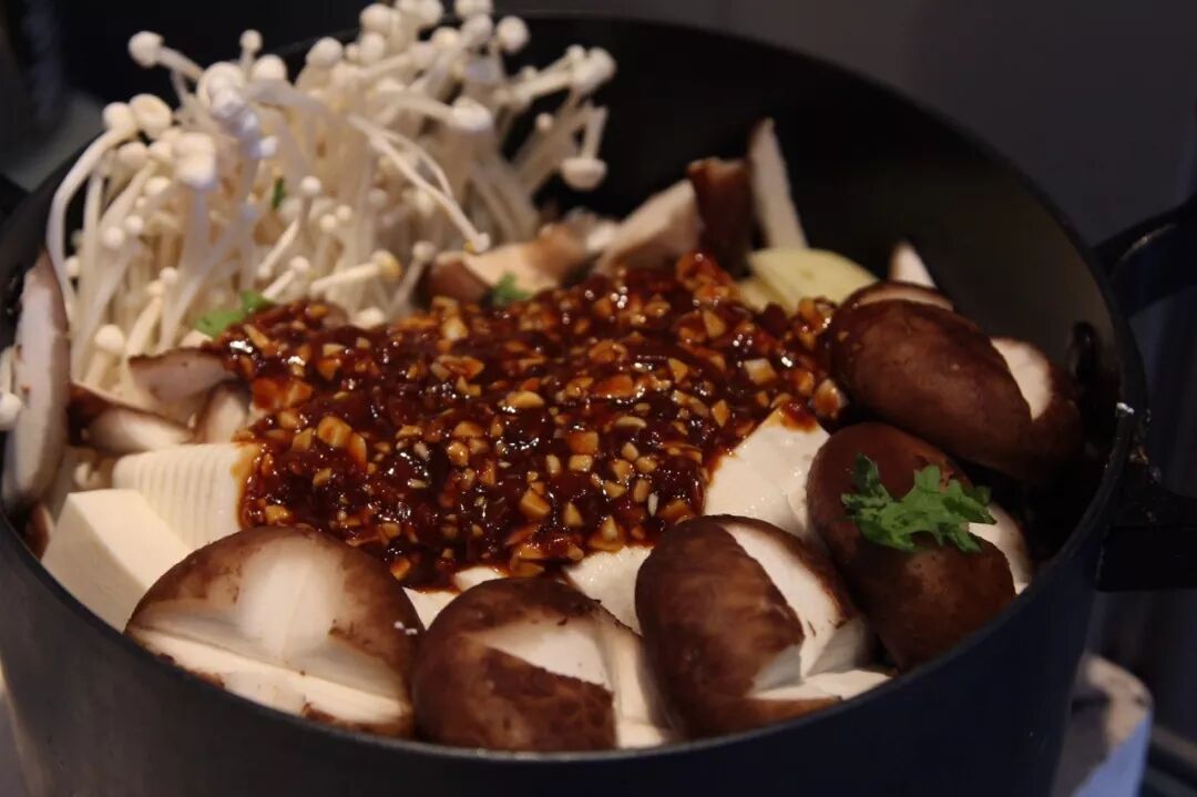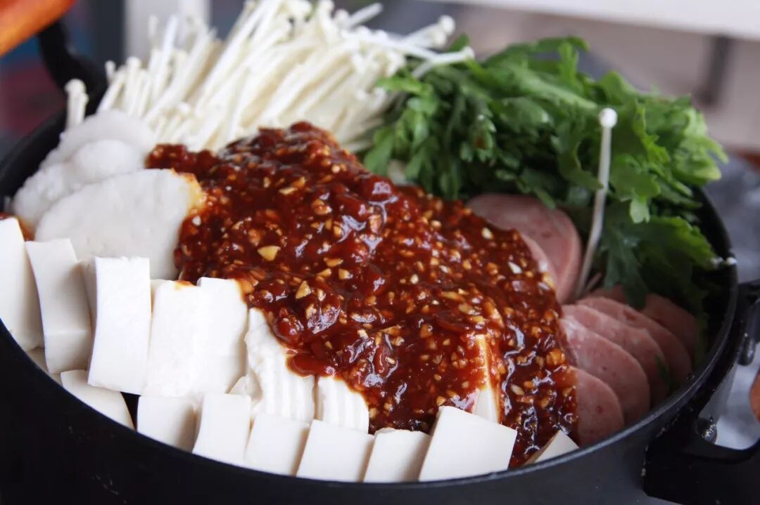 用上10分钟,将自己喜欢的各种菜、肉、豆制品、海鲜等铺满锅子,放入调味酱,随着水咕嘟咕嘟的冒泡,食欲也跟着沸腾,偶尔来这么一锅,犒劳一下为生活奔波的自己,嘴巴和心都满足。