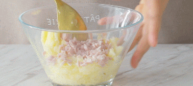 2)将煮好的土豆剥去外皮,放入碗中,用压土豆器(或大勺子)压成土豆泥,直到没有颗粒。