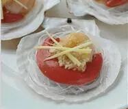6. 在清洗干净扇贝肉上撒少许盐、白酒和白胡椒粉拌匀后,再放点淀粉拌匀,腌制待用。