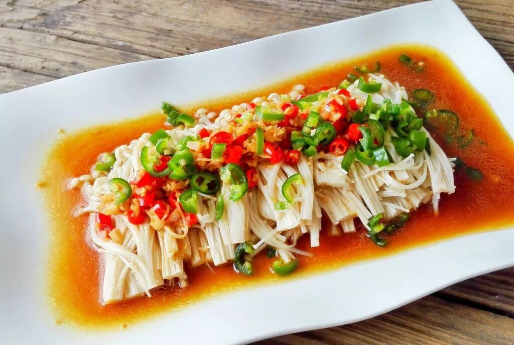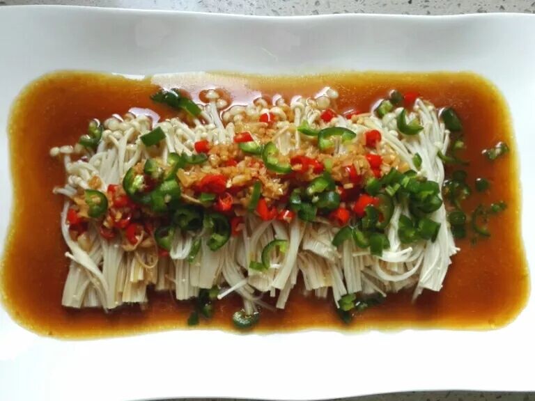 3. 小米辣、大蒜切碎,蒸出的水不要倒掉,留着备用,金针菇捞出装盘。