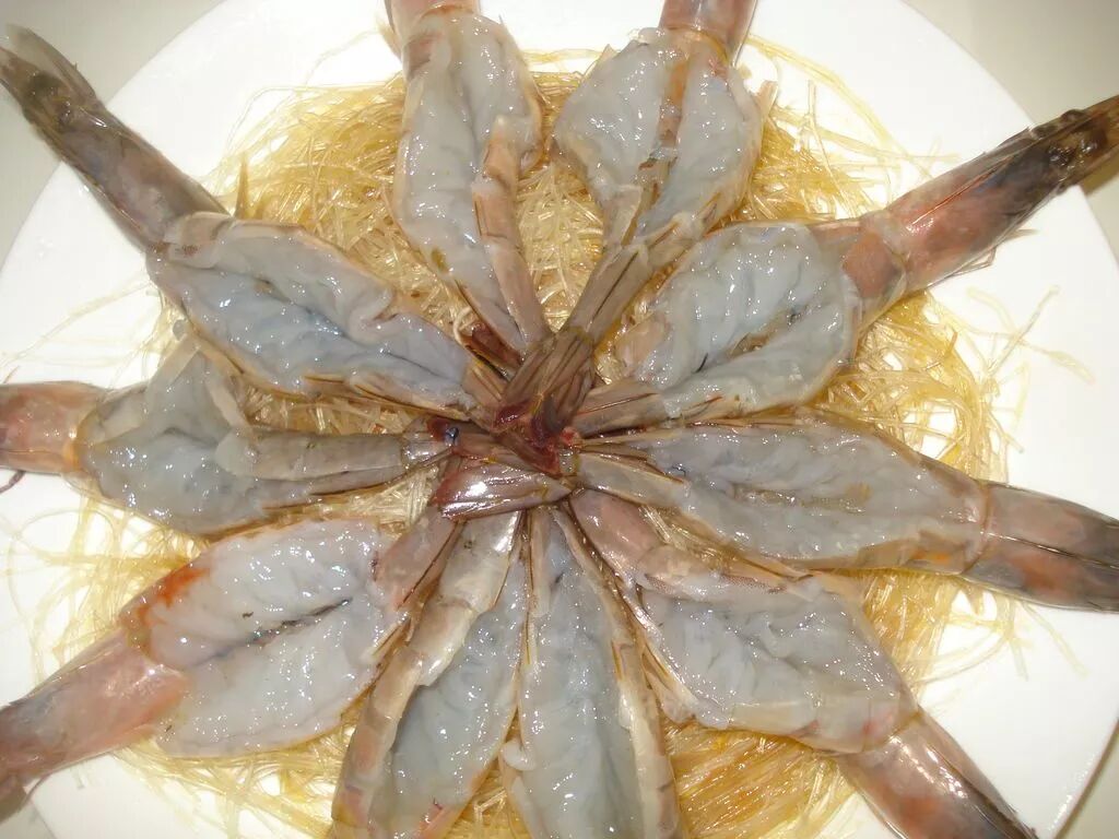 5. 取一盘子,放上搅拌均匀的粉丝,大虾在虾背劈开,去掉虾肠,用刀拍平,平铺在粉丝上。