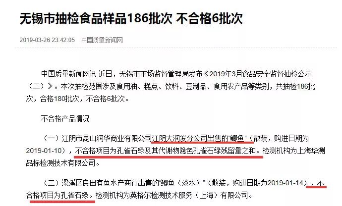 江苏无锡市场监督部门抽检发现,在江阴市某大润发分公司和梁溪区某水产商行出售的鲫鱼