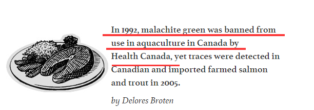 1992年加拿大率先禁止使用孔雀石绿作为渔场杀菌剂。