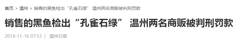 《销售的黑鱼检出“孔雀石绿” 温州两名商贩被判刑罚款》