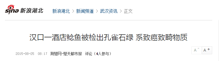 《武汉上和记酒店鲶鱼检出含孔雀石绿 系高效致癌物质》
