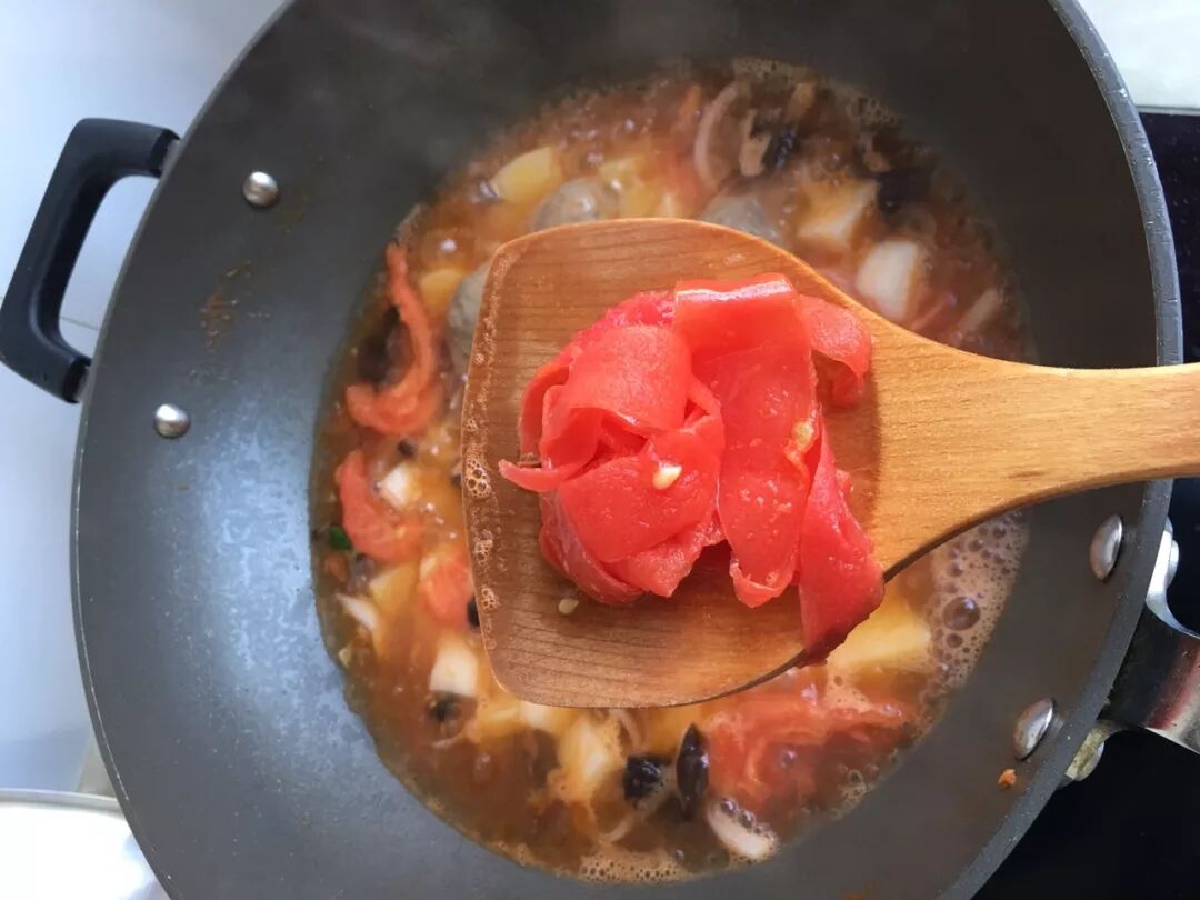 在煮汤的过程中,我们可以把番茄皮挑出来,因为提前翻炒过,所以用筷子轻轻一夹就是分离开的状态,挑出番茄皮个人感觉用餐体验会更棒。