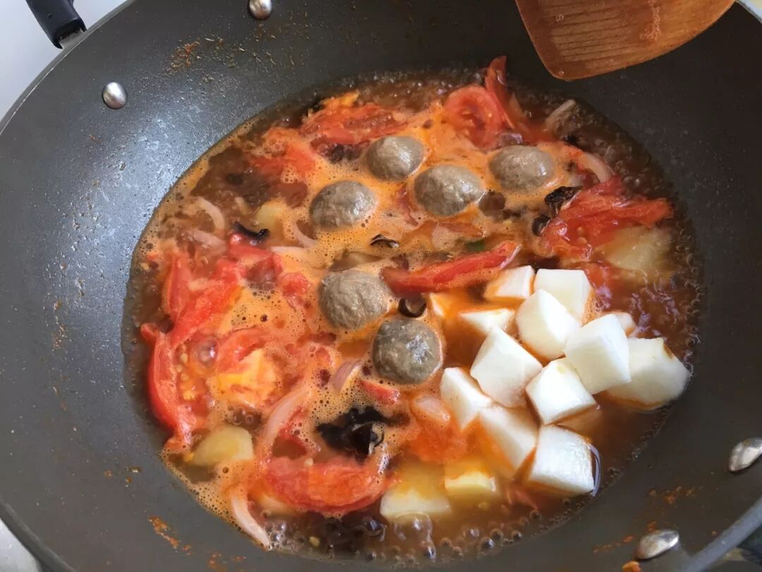 放入牛肉丸,放入切好的山药块大火煮沸水后,转小火闷煮10分钟。