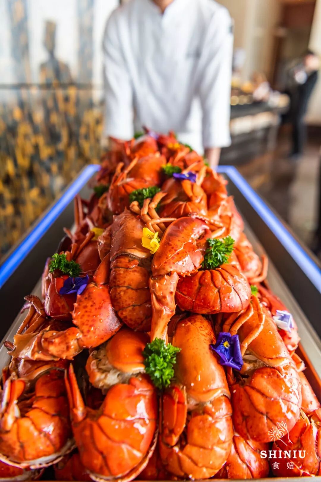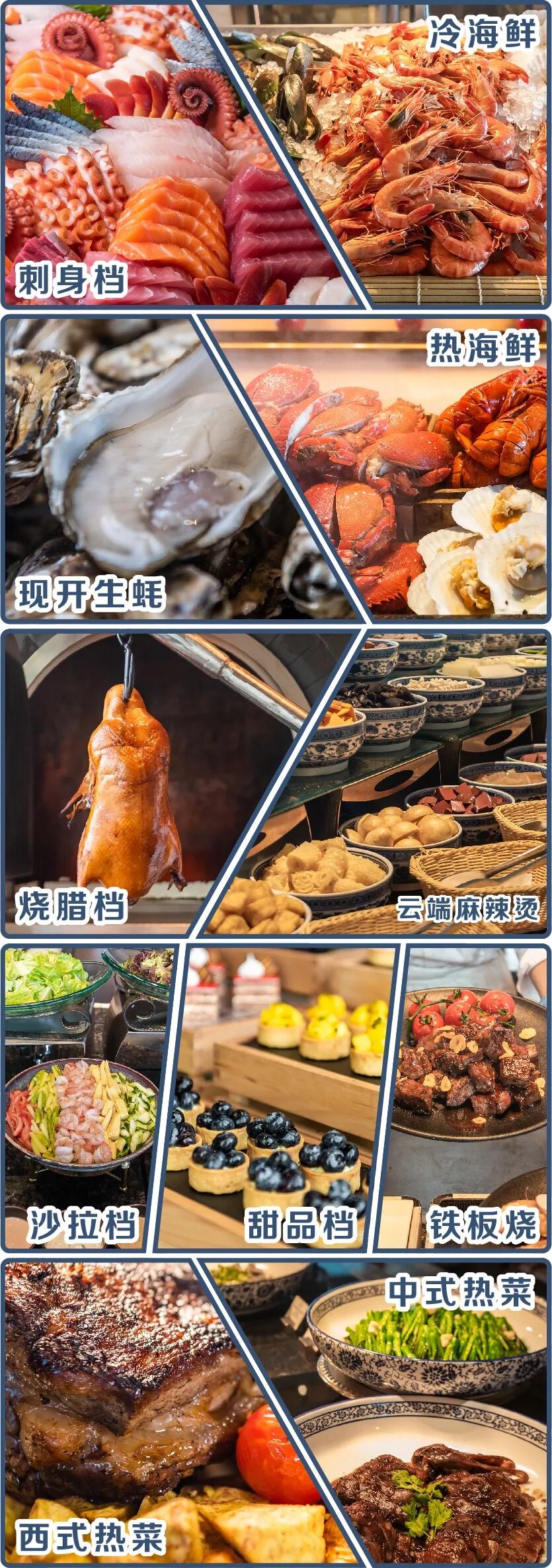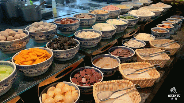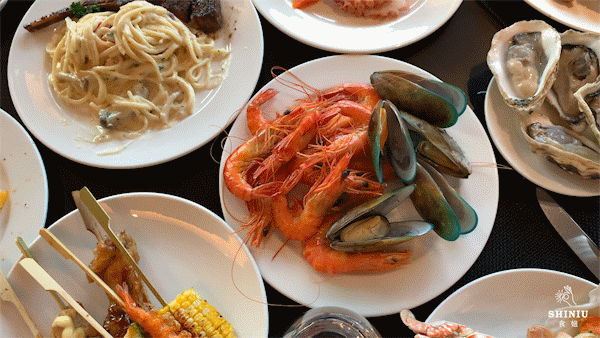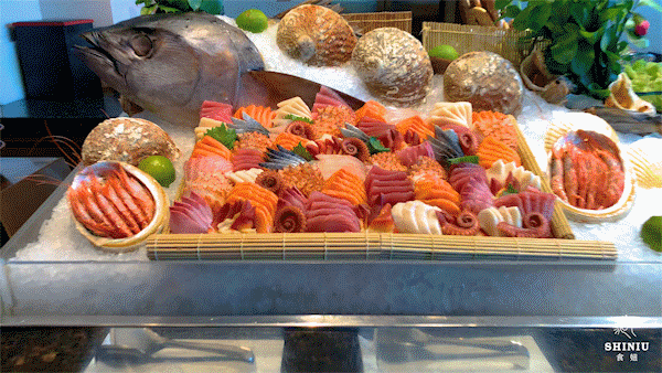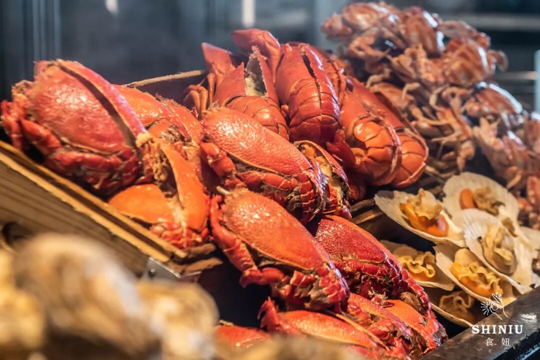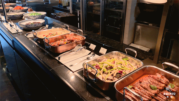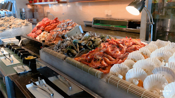 除了美景以外,瑞吉酒店的秀餐厅还推出了午餐和晚餐自助,全方位开放式厨房,菜品种类超丰富,设置了9个档口:海鲜、刺身、铁板烧、中式热菜...