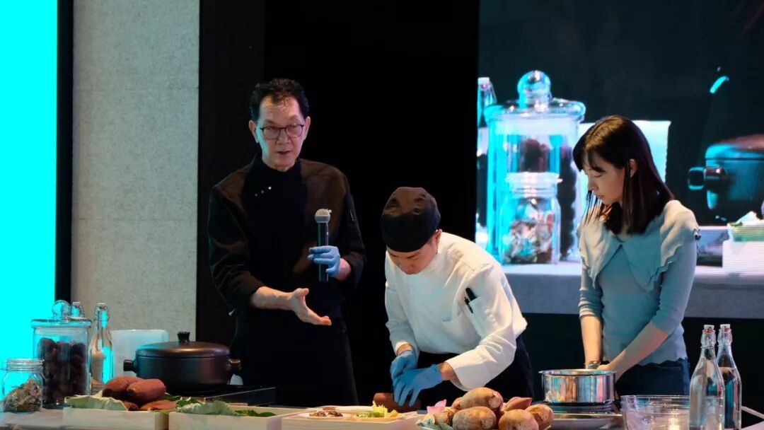 邓锡漳(左)、罗晓(右)在峰会上演示一道甜点:黑米莲藕的制作