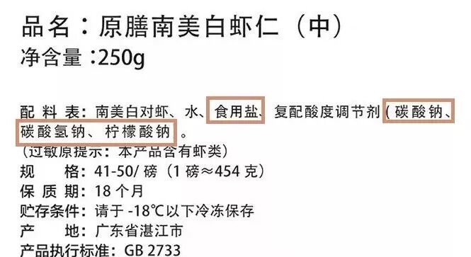 查询食物成分表的信息,发现了两者钠含量的确差别很大:新鲜虾仁是119mg/100g,而某品牌的冷冻虾仁是350mg/100g,高出不住一倍。