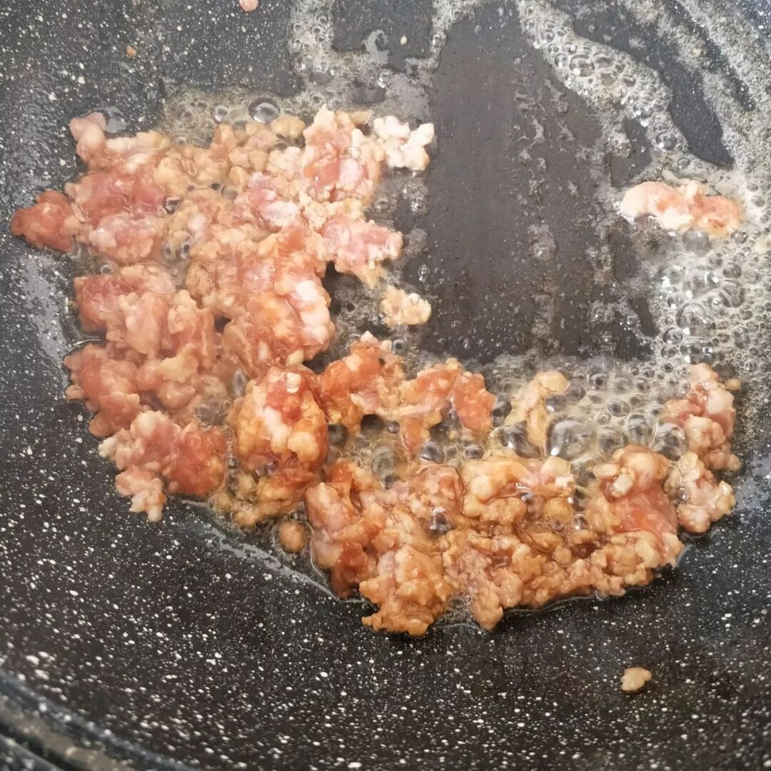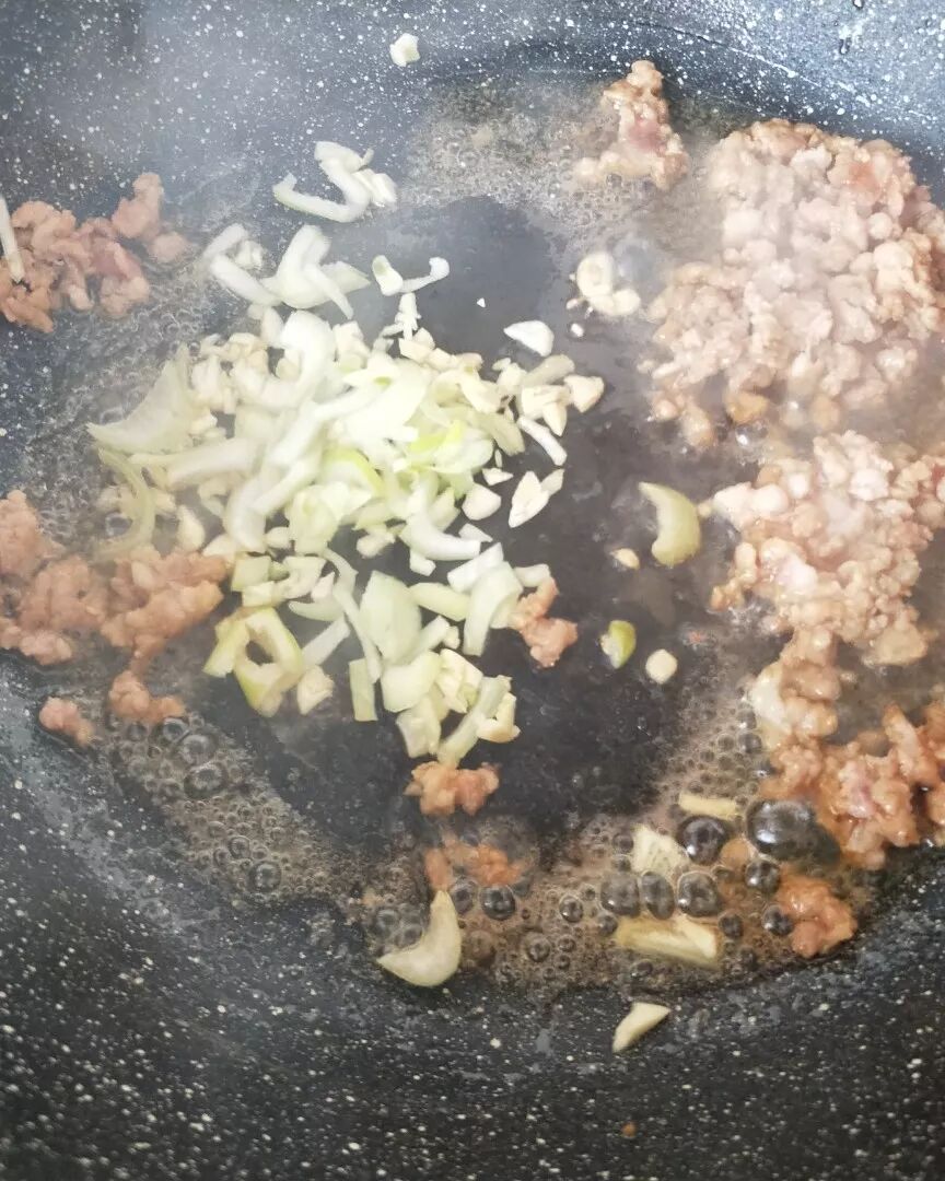3 | 肉末变色后加入蒜末、葱花炒香。
