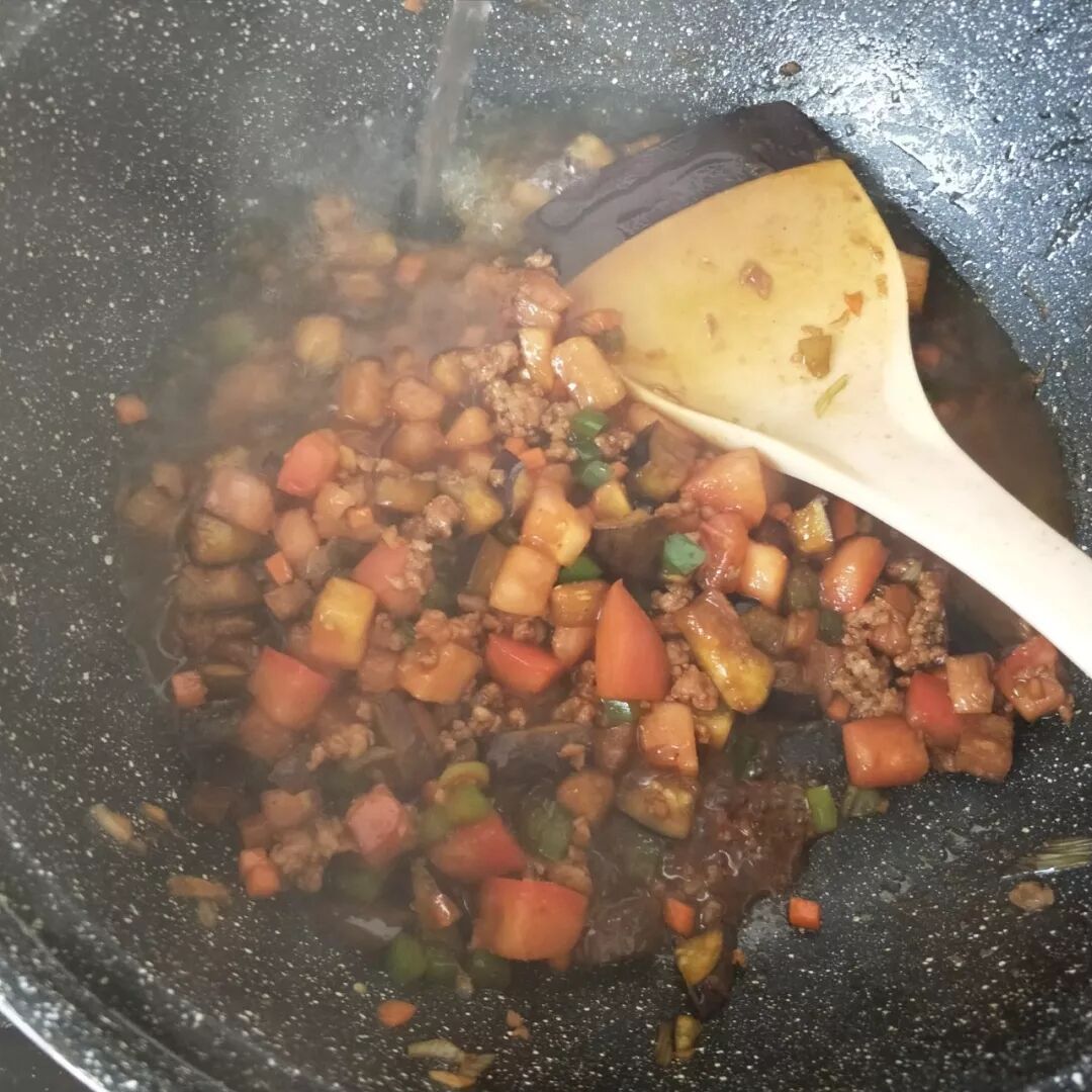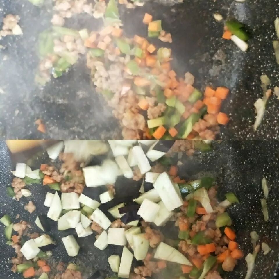 4 | 放入胡萝卜丁和青椒丁,炒软之后放入茄子翻炒。