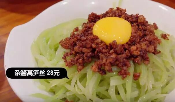 炸酱莴笋丝很有创意啊,还打了一个生鸡蛋。只是,这个是可生食的吗?戳一戳,蛋液就像坐滑滑梯一样就下来了。赶紧拌一拌,不拌不知道,这莴笋也是用猪油炒过的,不然不会这么香。猪油香混合着热气袅袅升起,全桌人都不由自主地盯着这碗莴笋。