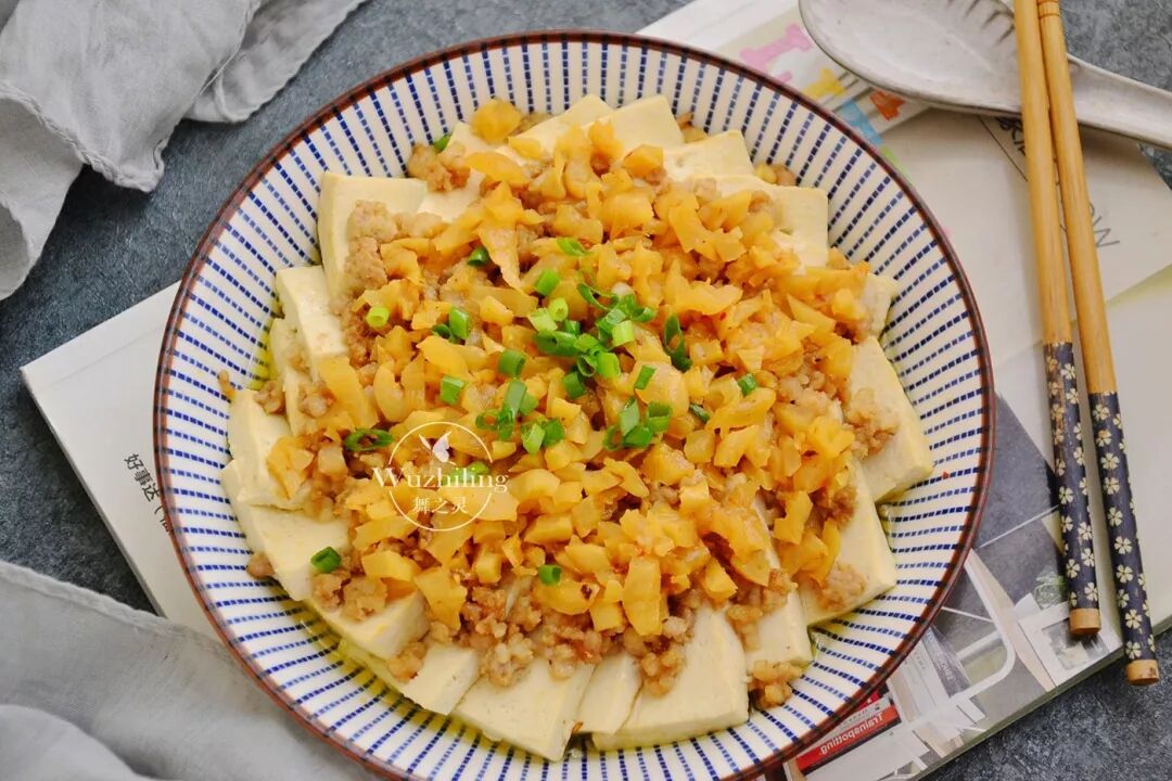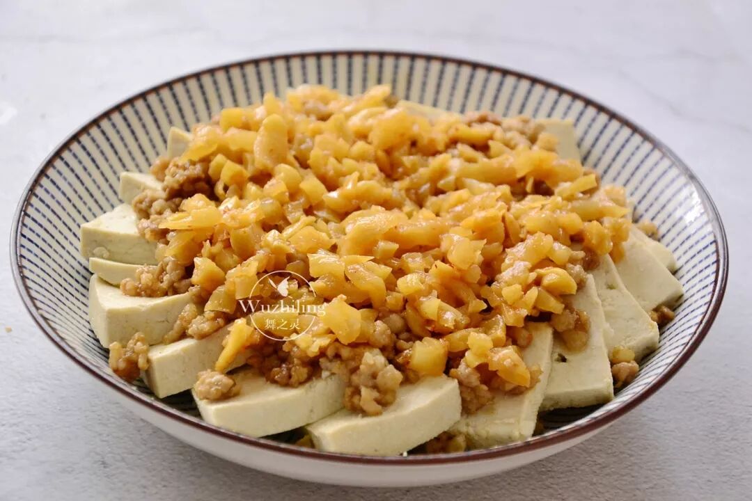 3. 接着,我们将炒好入味的肉末直接盖在豆腐块上,均匀的铺开就好,然后将事先剁碎的榨菜也码上去。