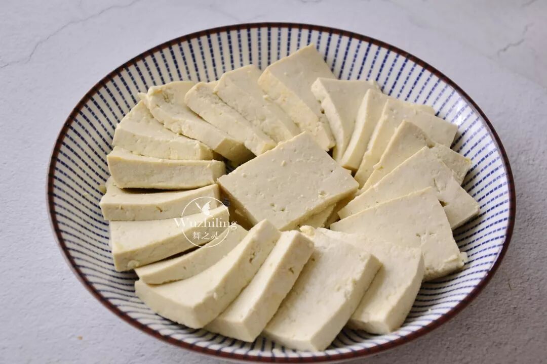 1. 首先我们要将豆腐切成厚片,然后码在深盘上。豆腐有南豆腐和北豆腐之分,这个没有特别讲究,喜欢韧劲的用北豆腐,喜欢口感嫩滑的就选择南豆腐吧。