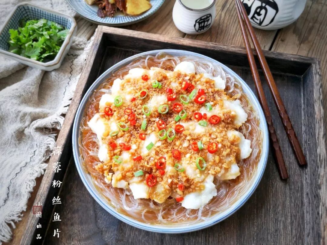 6. 将泡好的粉丝沥水后平铺在盘中,在粉丝上面铺上腌制好的鱼片。