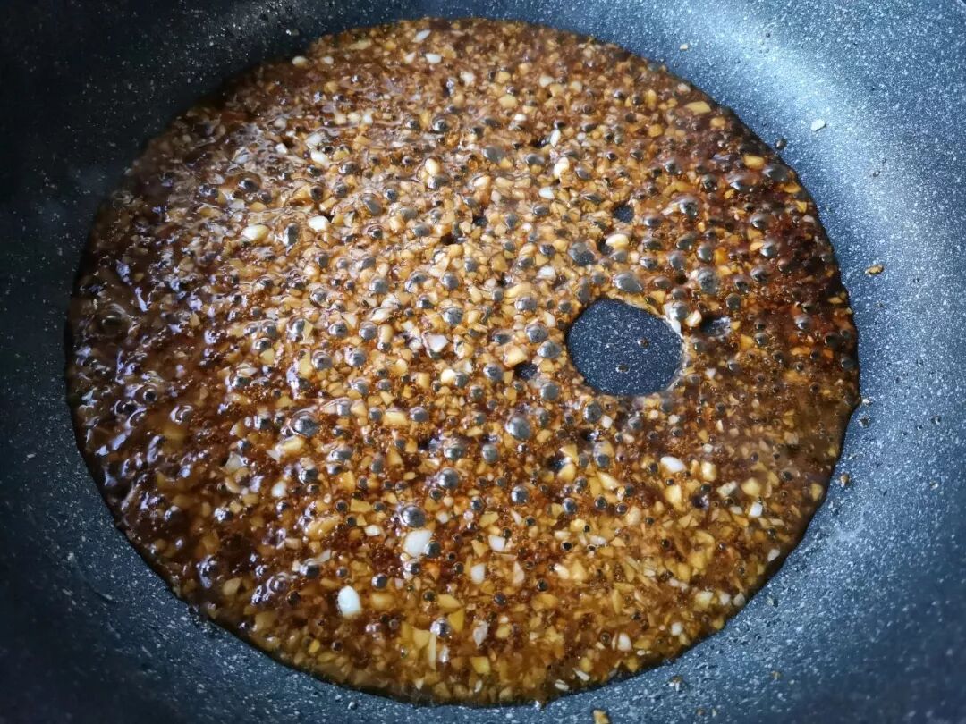 7. 锅中适量油烧热下蒜末,爆出香味只蒜末金黄色。倒入调好的料汁,(可以根据需要稍微加点水)煮至汤汁浓稠即可。