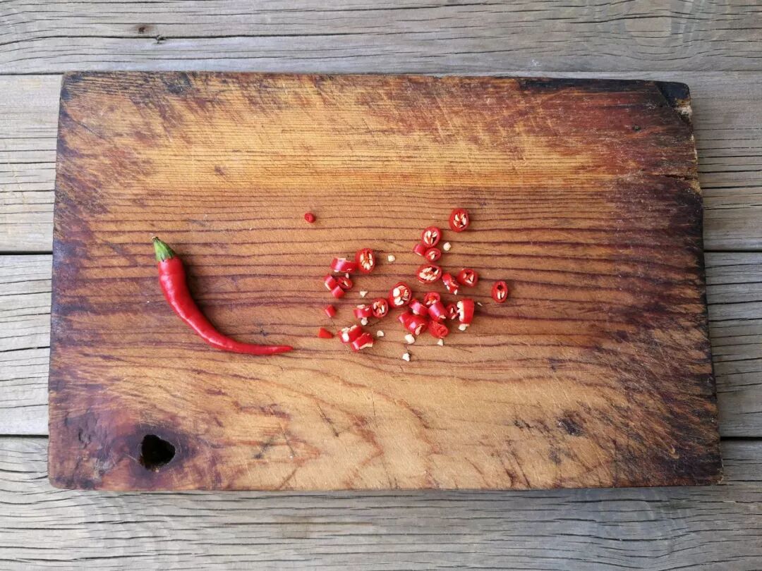 4. 蒜去皮去蒂切成蒜末,小米辣洗净切圈。