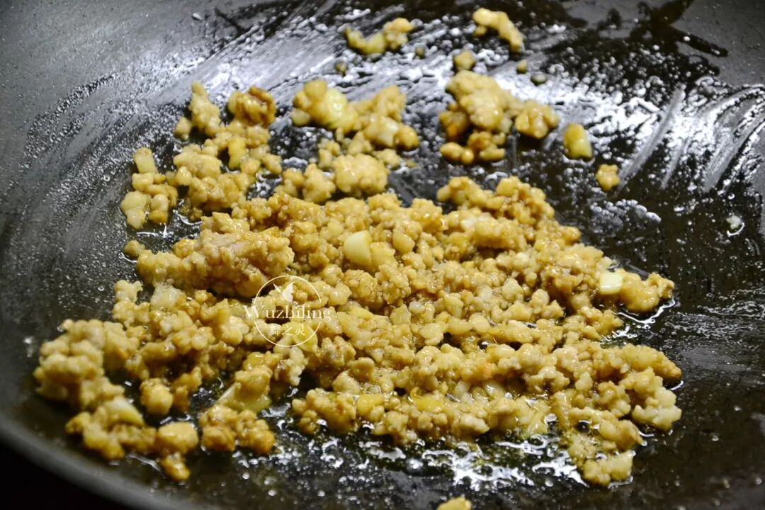 2. 然后开始炒肉末,锅里面放少许的油,将姜蒜末和肉末一起放入煸炒,炒变色后加入蚝油、糖和少许的料酒继续炒均匀后放点鸡精调味就盛出来。
