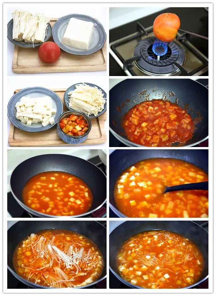 第三步:把嫩豆腐切成小块、去皮的西红柿切块、金针菇撕开、葱切碎备用。