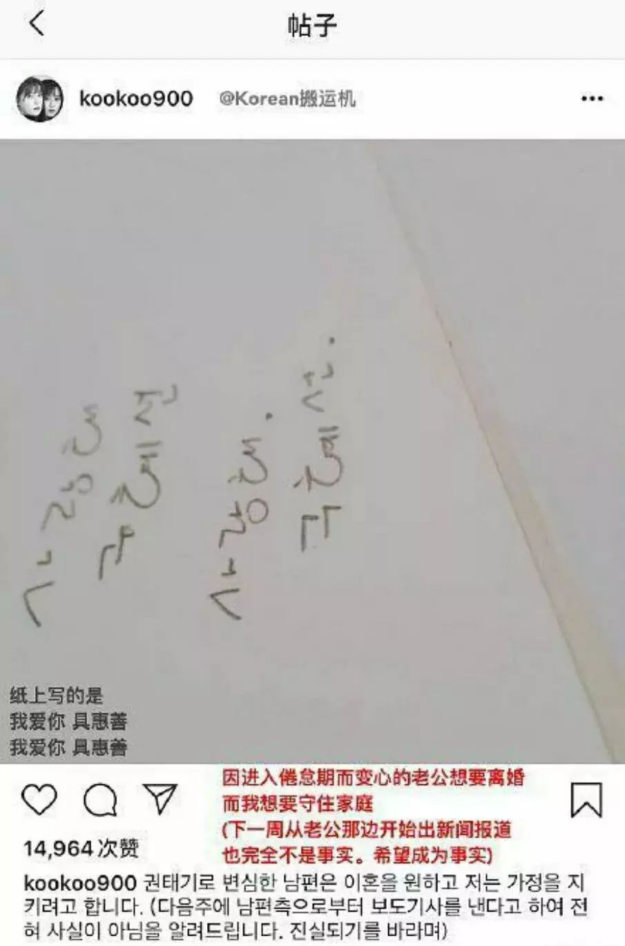 8月18日,由韩版《流星花园》走红的女星具惠善在社交平台上发文称老公向她提出离婚,她并不愿意,同时配上了丈夫安宰贤昔日手写的“我爱你”纸条试图挽回。