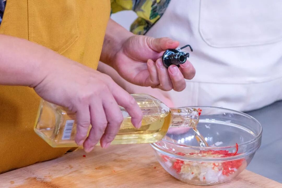 在装有辣椒蒜末的碗中倒入适量色拉油。