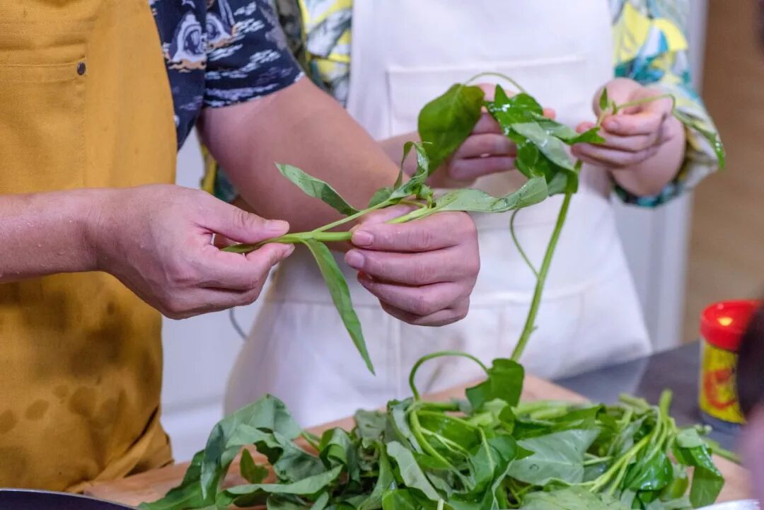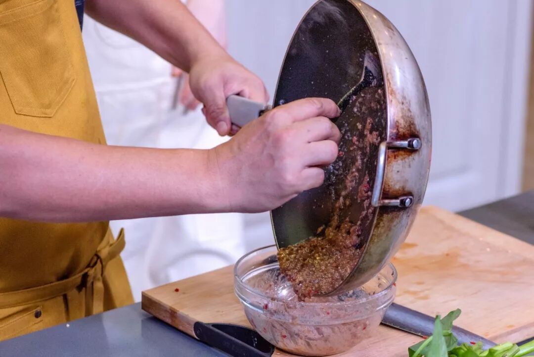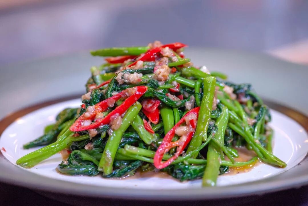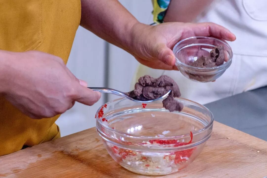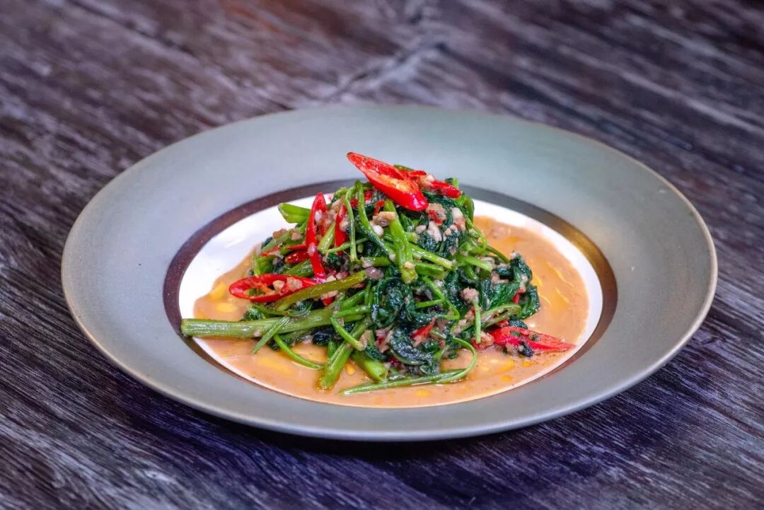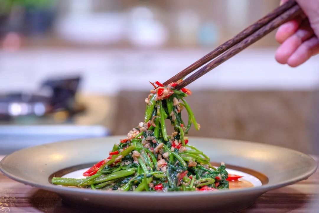 虾酱是东南亚等地常用的调味料之一,是用小虾加盐经自然发酵后制成的酱食品。师父告诉我,这道菜好吃的秘诀就在于这酱,浓郁臭香的虾酱和鱼露经过煸炒把香味都炒活了,空心菜跟虾酱碰撞后,菜汤会慢慢释放出来,口感更脆爽甘甜,让人止不住想来碗米饭。这道空心菜看似很家常,吃起来却有浓郁的异国情调,只要学会用虾酱和鱼露,你就可以尝试更多不同的吃法。