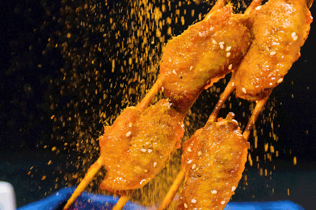 牛肉粒都是新鲜现切出来的,一定要及时下锅,还有各种小吃烤物,都值得一试哦!