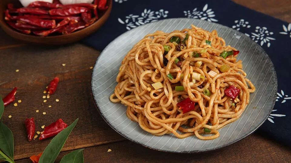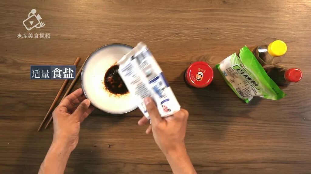 5.碗中放适量粉包,适量香油,适量醋,适量白砂糖,适量食盐,适量老干妈,倒入方便面搅拌均匀。