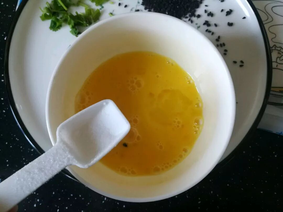 5. 鸡蛋打散,加入一点食盐,搅匀。