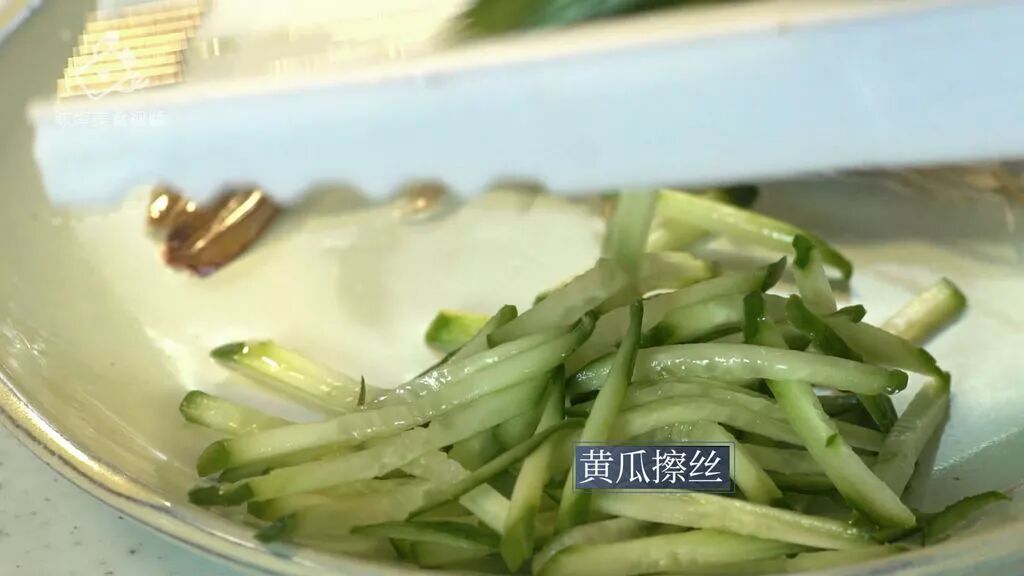 6. 摆上白虾和黄瓜丝,放适量榨菜即可。