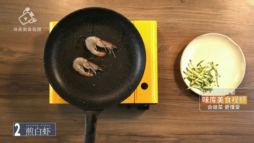 3. 热锅倒适量食用油,白虾煎至金黄,放适量食盐和黑胡椒。