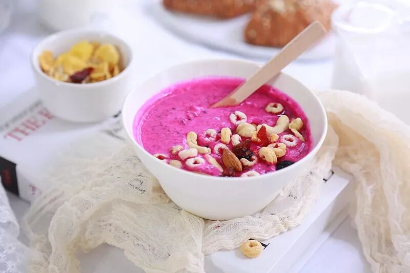 把它和酸奶一直做成奶昔,再加一些坚果和燕麦,既美味又饱腹,越吃越美哦~