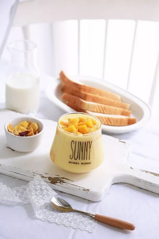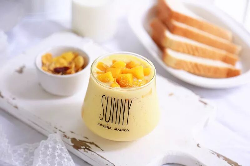 芒果,滋味醇厚,切成块可以直接用来装饰甜点,用它做成奶昔,更是口口丝滑,营养有滋味。再搭配一片面包,完美的一顿早餐。