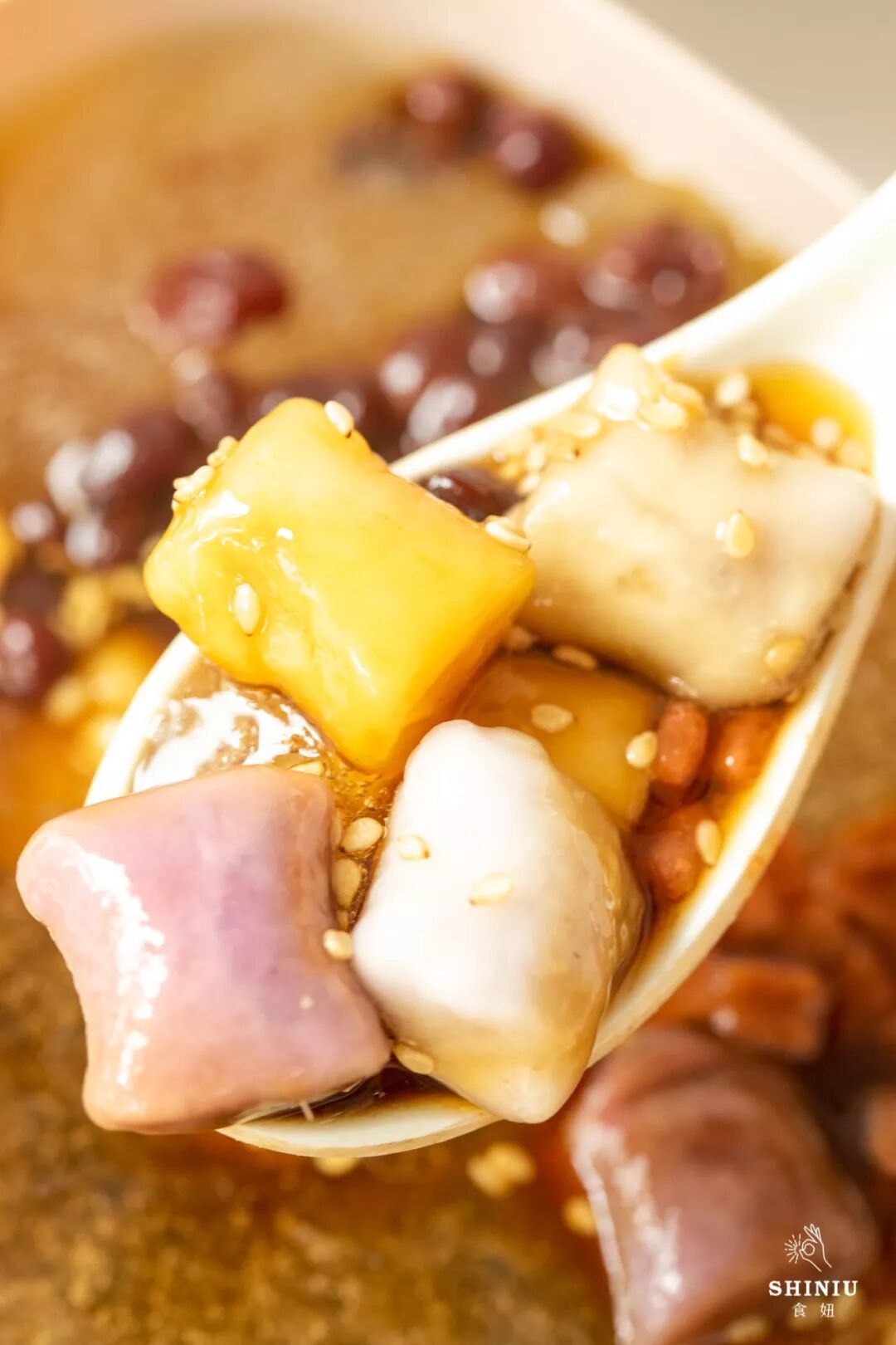 手搓冰粉本身就已经很Q了,还加了不少糍粑和芋圆。吧唧吧唧吧唧,我的嘴就没停下来过,嚼着吃的冰粉太过瘾了。