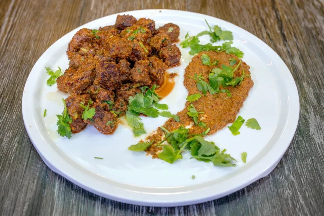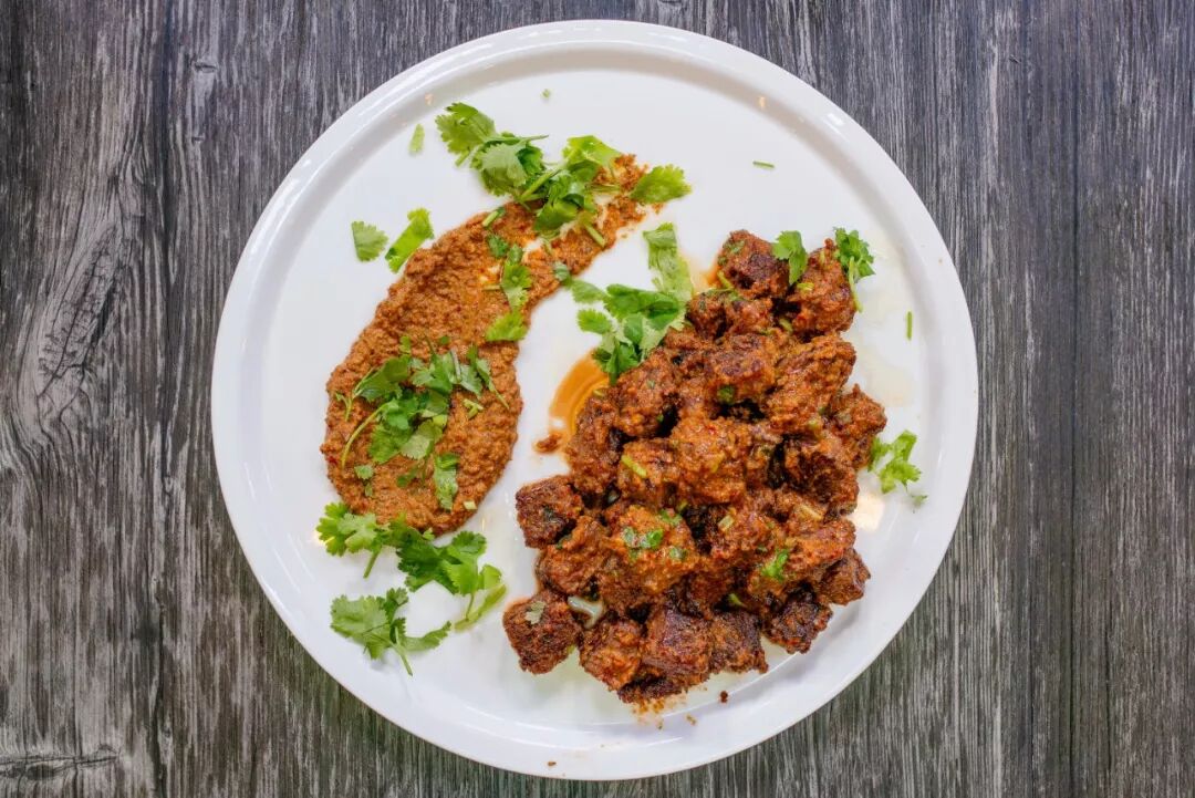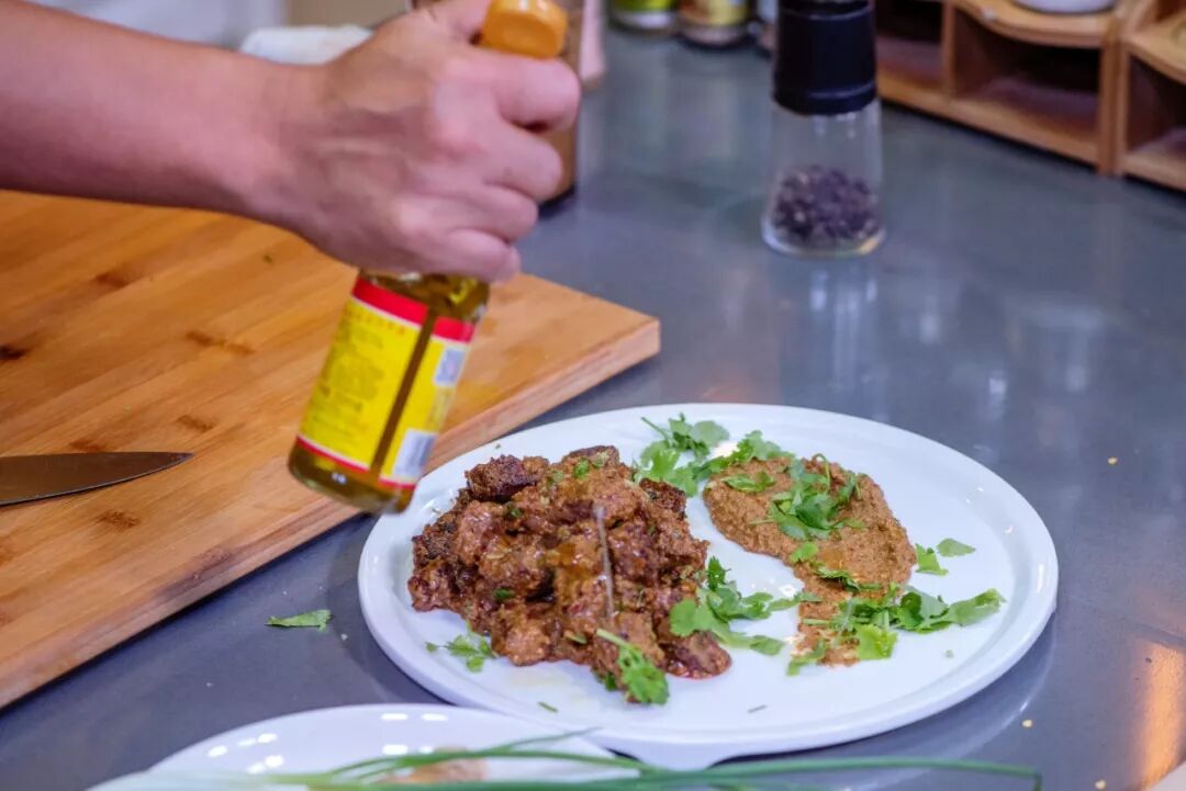 炒好的坚果蒜香牛小排盛盘,并在菜品旁边加一勺坚果酱。