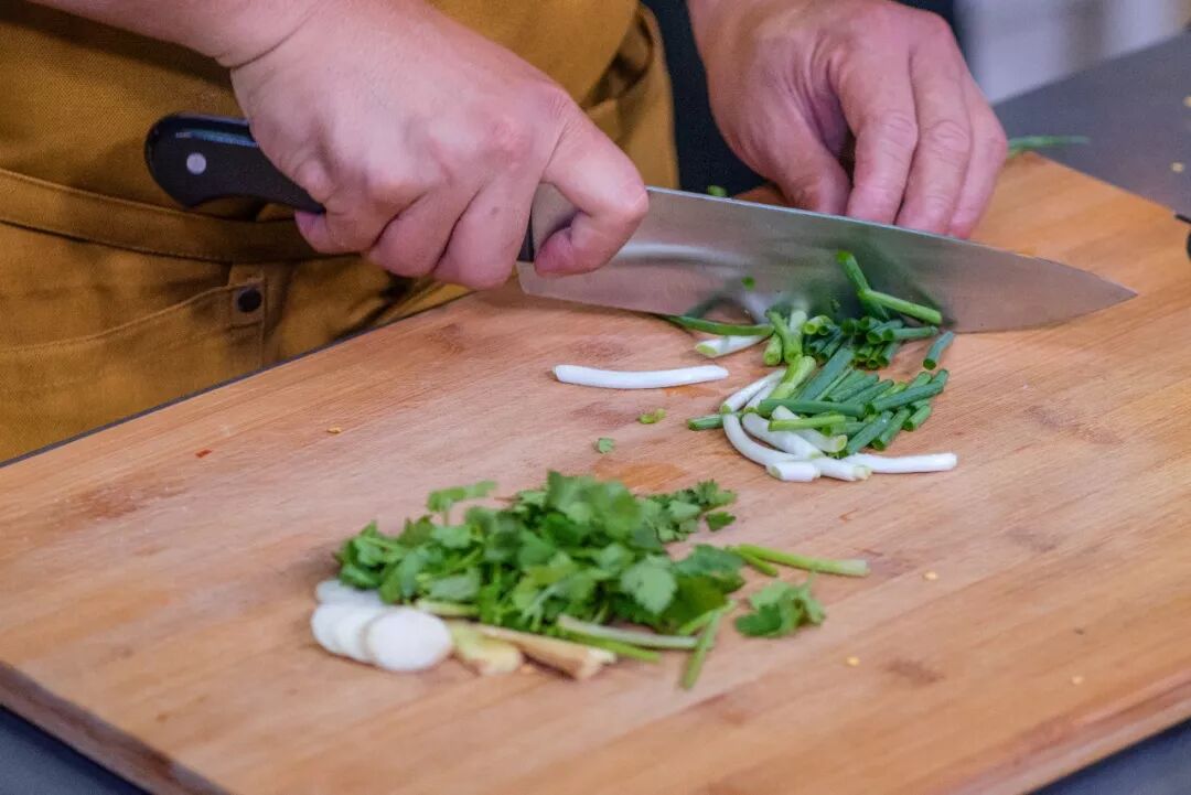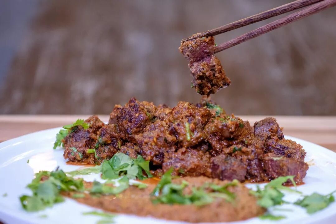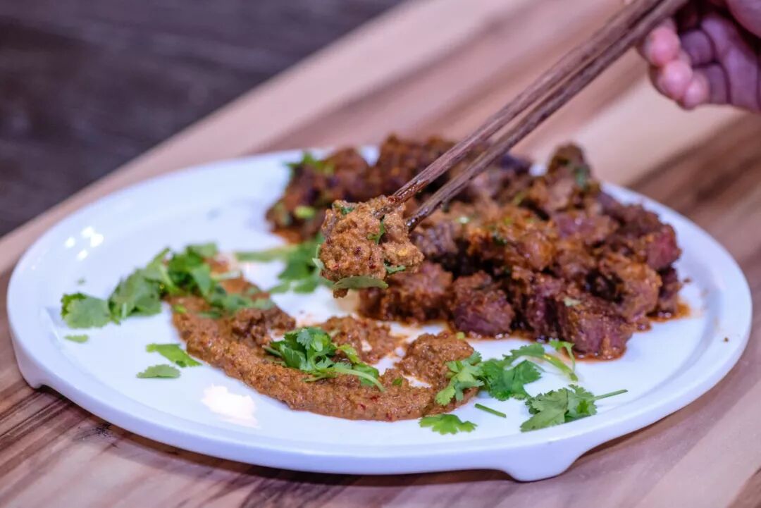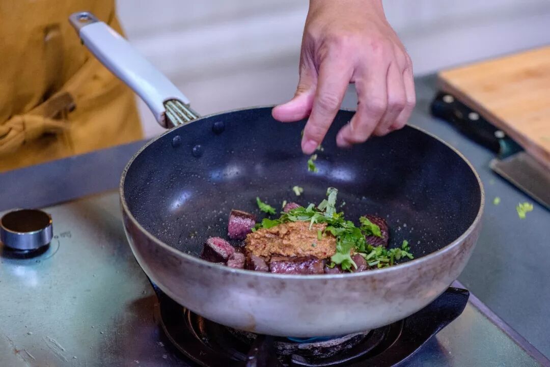 锅中加入坚果酱、切碎的香菜与牛小排拌匀翻炒。