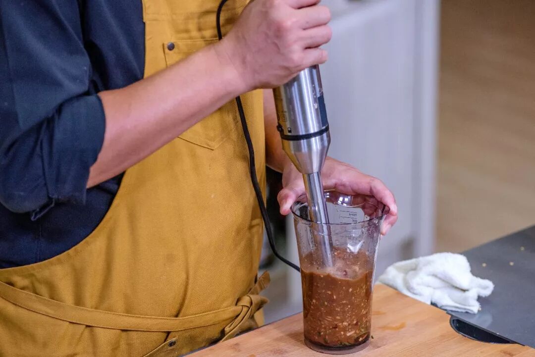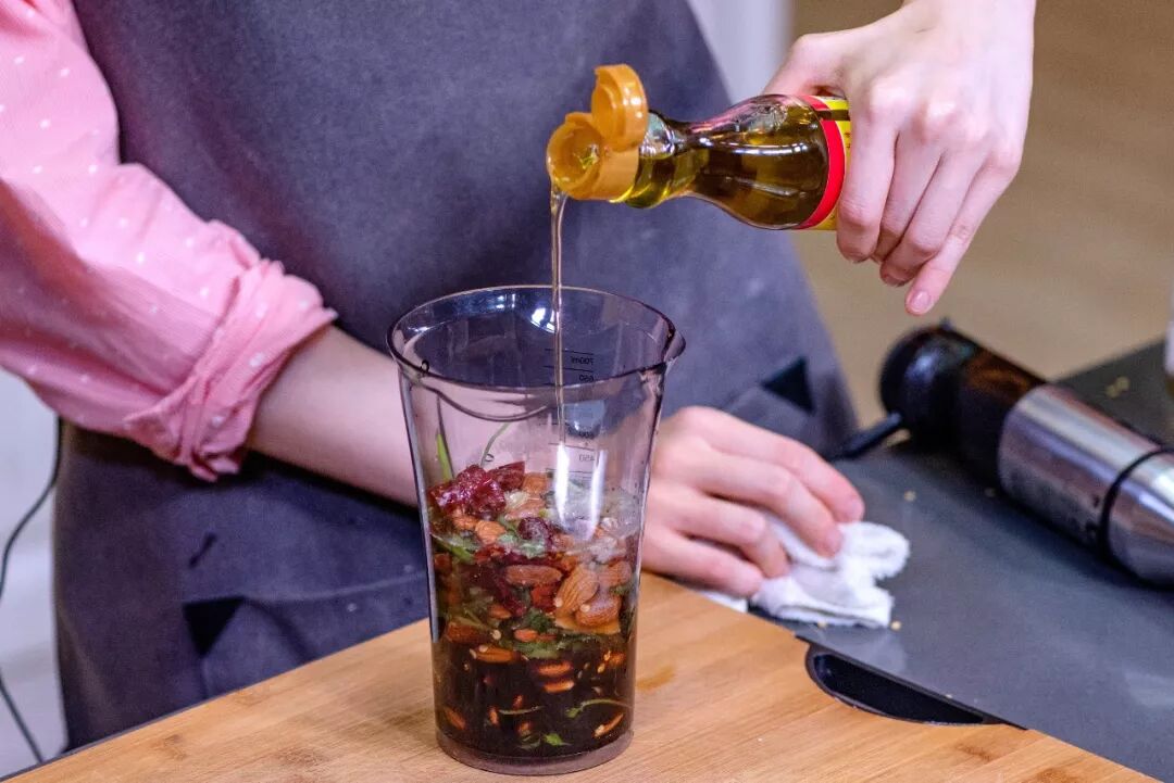 炒好炒香的杏仁果放入调理机中,然后加入适量酱油、盐、白胡椒、水调味。