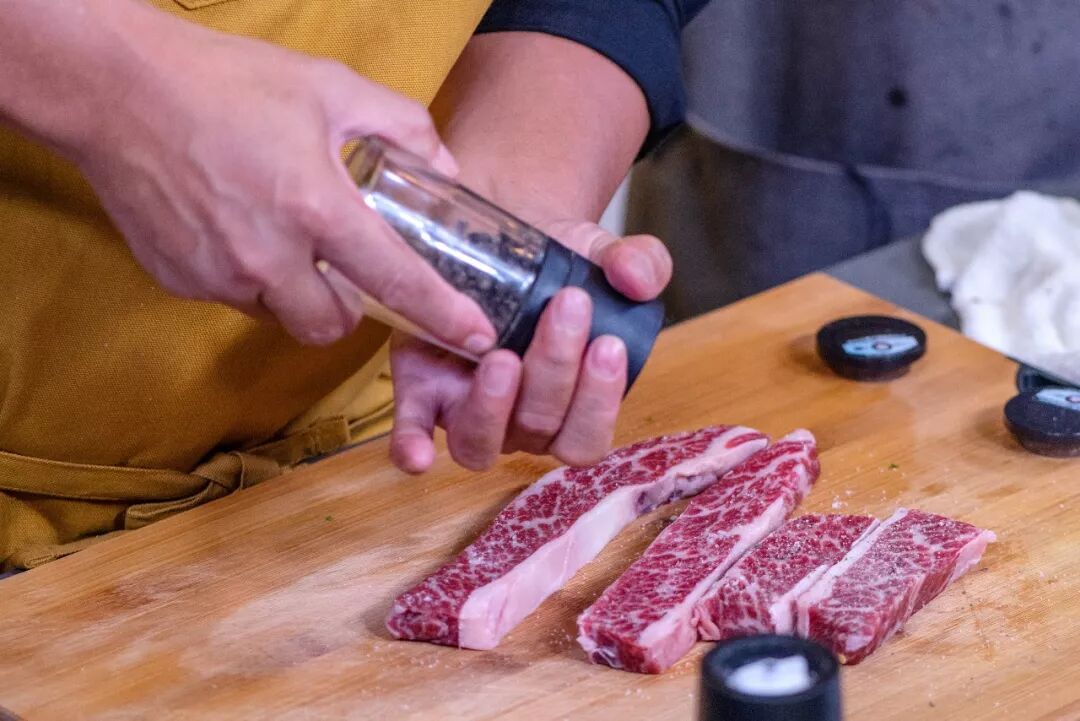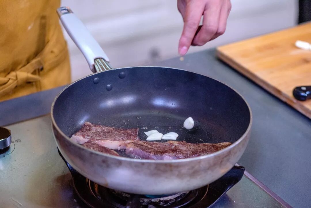 牛小排煎至两面金黄后出锅,冷却一分钟后切块。