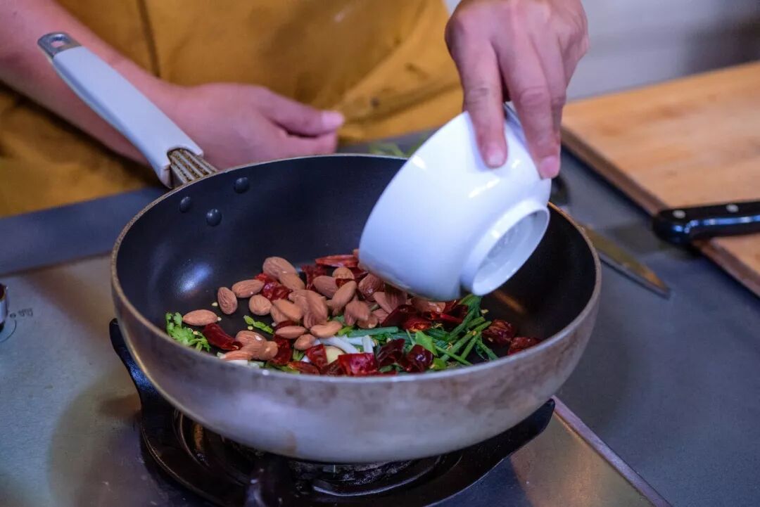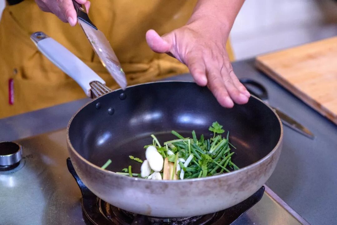 切好的葱姜蒜、香菜、干辣椒放入锅中煸炒。