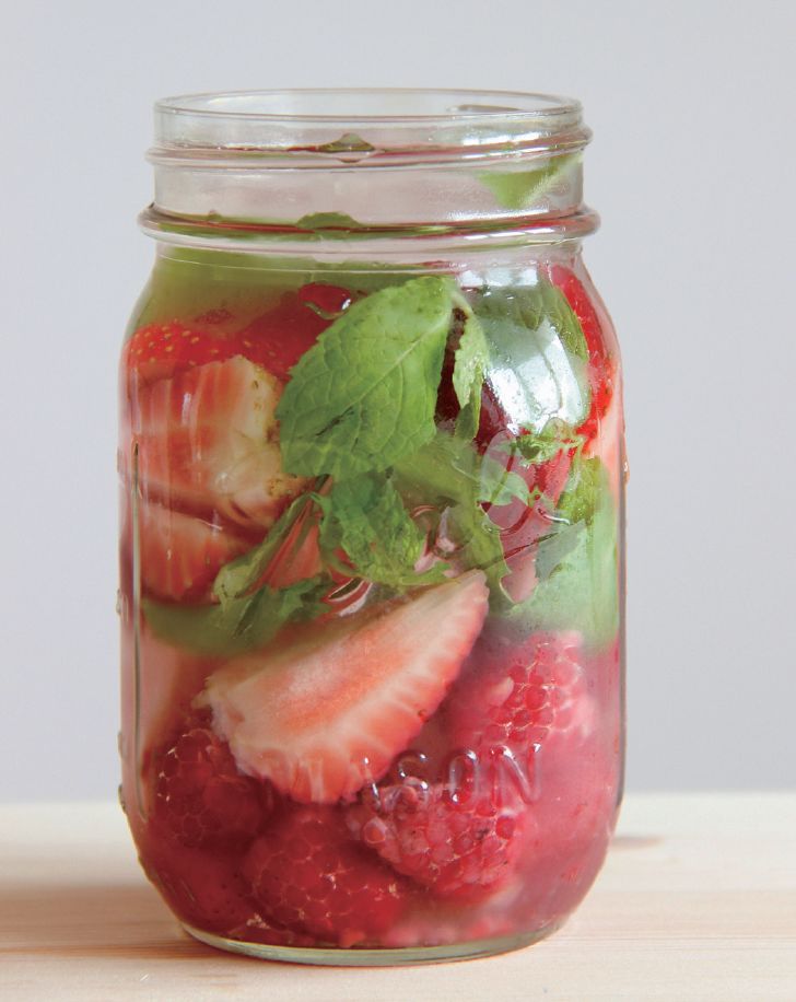 树莓稍加冲洗,切勿浸泡;草莓在盐水中浸泡 10 分钟后冲洗切块;薄荷洗净去根。将树莓、草莓块、薄荷浸泡在纯净水/苏打水中,密封冷藏 4 小时即可饮用。