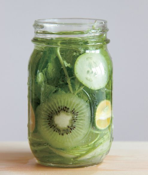 青柠洗净对切,黄瓜洗净切薄片,薄荷洗净去根,奇异果去皮切片。将青柠块、黄瓜片、薄荷、奇异果片浸泡在纯净水/苏打水中,密封冷藏 4 小时即可饮用。