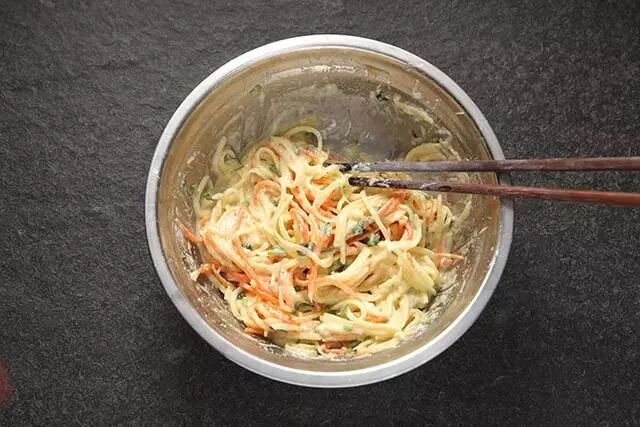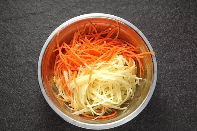 土豆和胡萝卜刨丝放盆中,用水洗一下,把土豆的淀粉洗出一部分,沥一下水,放盐抓匀腌十分钟左右
