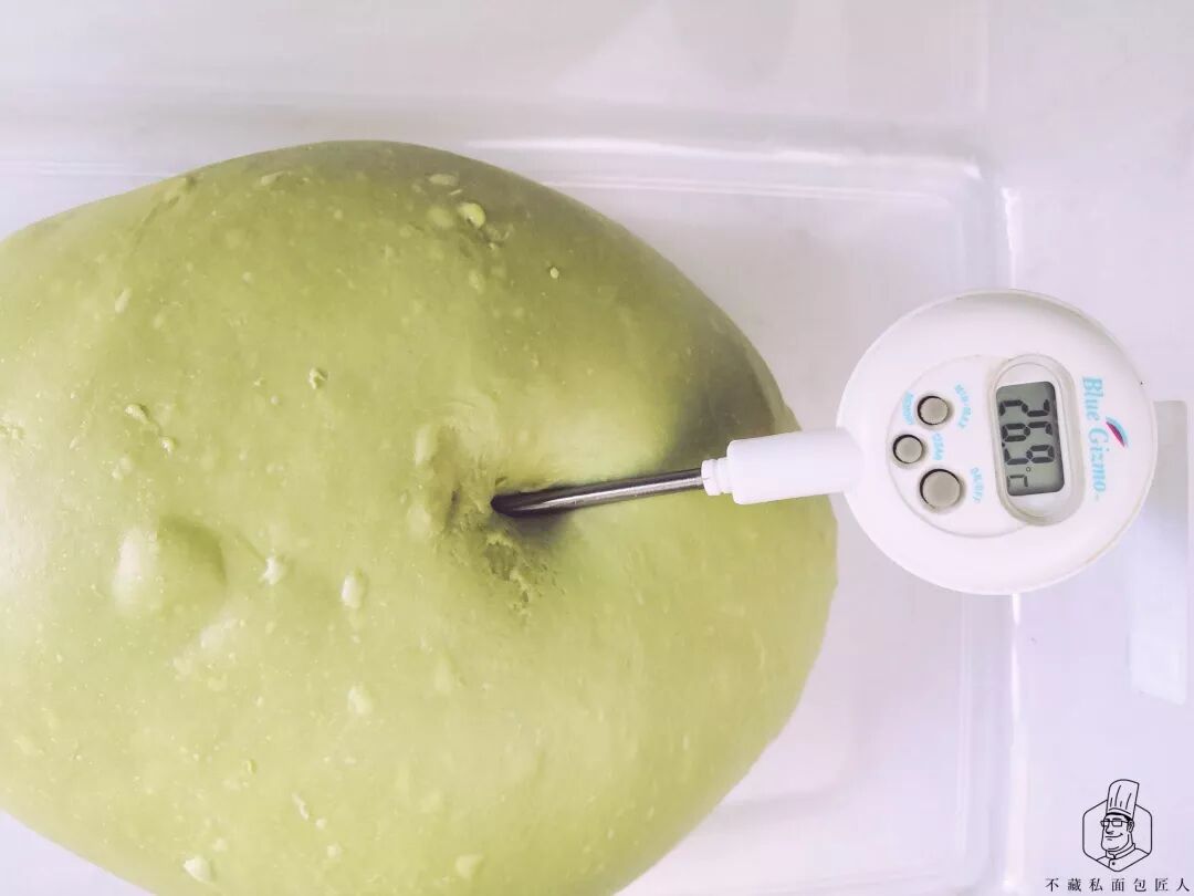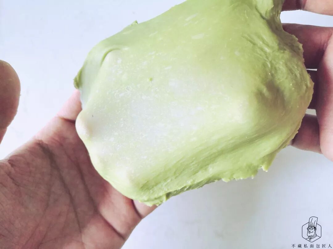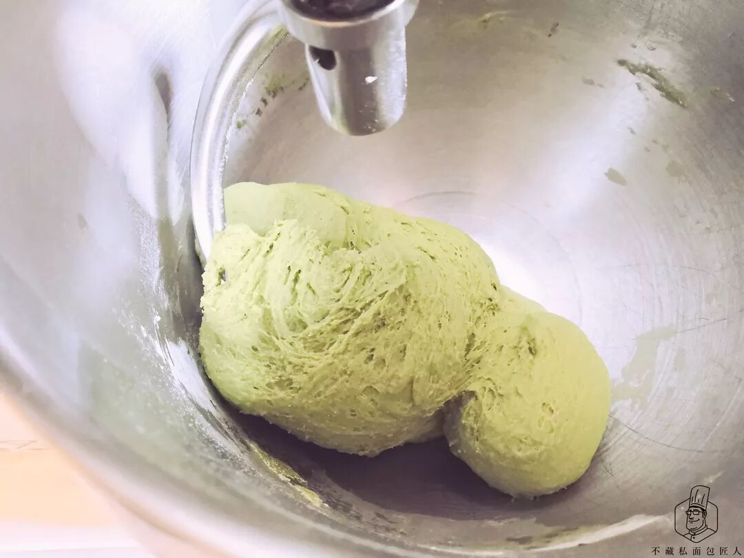 1、打面:将抹茶面团中除了盐和黄油以外的材料倒入厨师机中,低速搅打5分钟(2-3档),然后换高速搅打8分钟左右至面筋扩展(6-7档)。