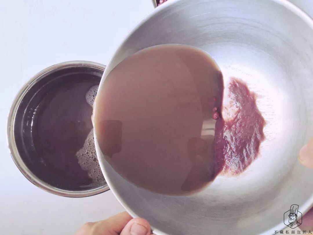 3、滤出红豆,煮红豆的水放一旁静置1小时以上,倒出上面部分的红豆水。