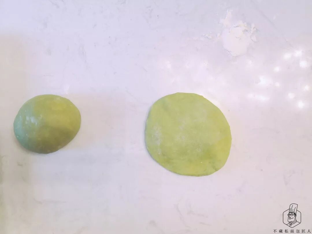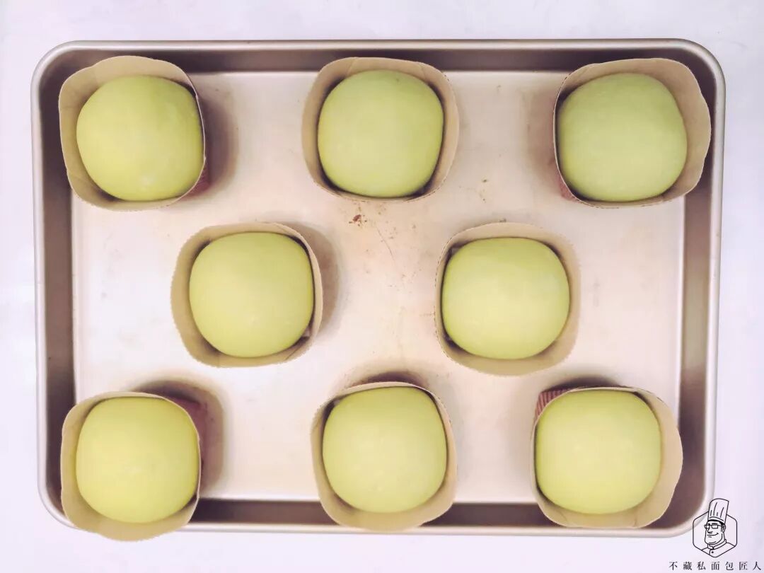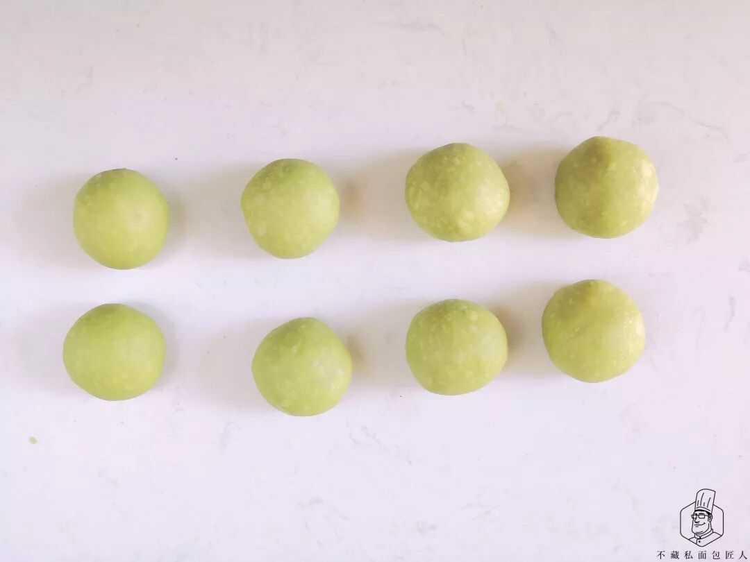 6、待身体部分的抹茶面团发酵好,取出后分割松弛:分成8个60g的面团,滚圆,温度28℃松弛25分钟。