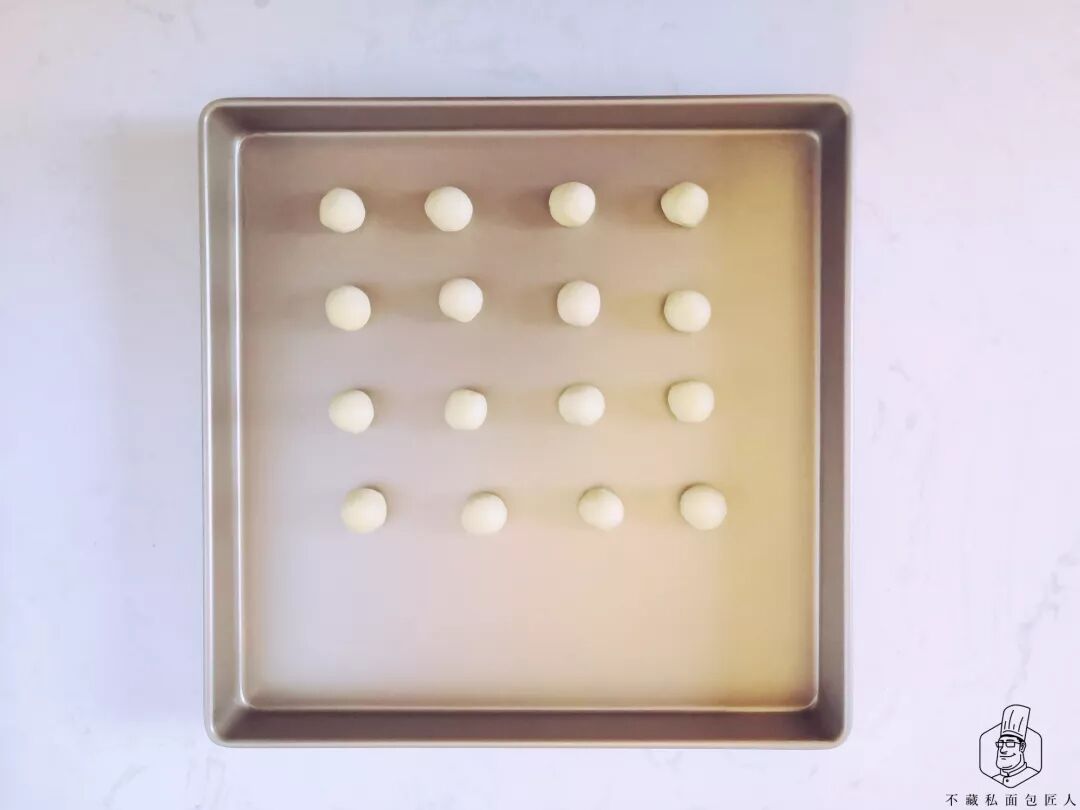 5、抹茶面团发酵期间,做眼睛部分的面团:将所有材料混合揉匀,保鲜膜包好放冰箱冷藏30分钟后取出,分成16个5g一个的小面团,搓圆待用。