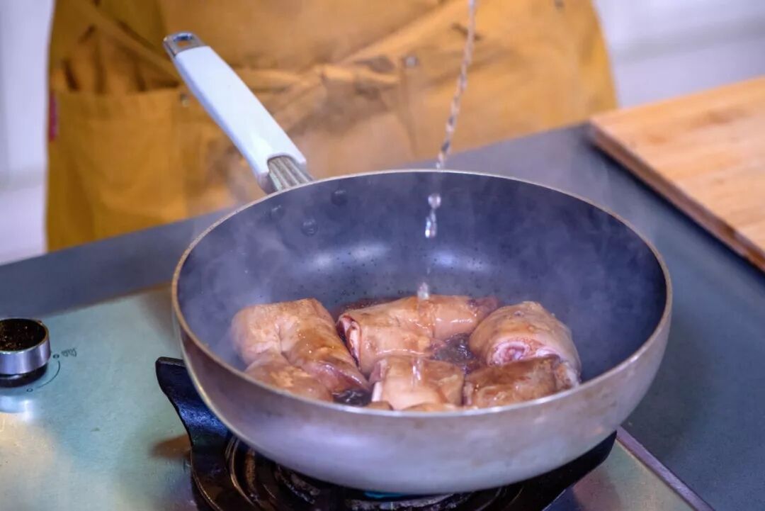 将猪脚放入锅中干煸,然后加入适量的糖,增加猪脚的焦糖色。