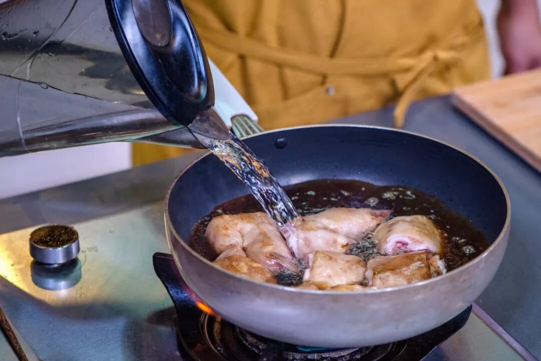将炖煮好的猪脚倒入炒锅中煨煮。